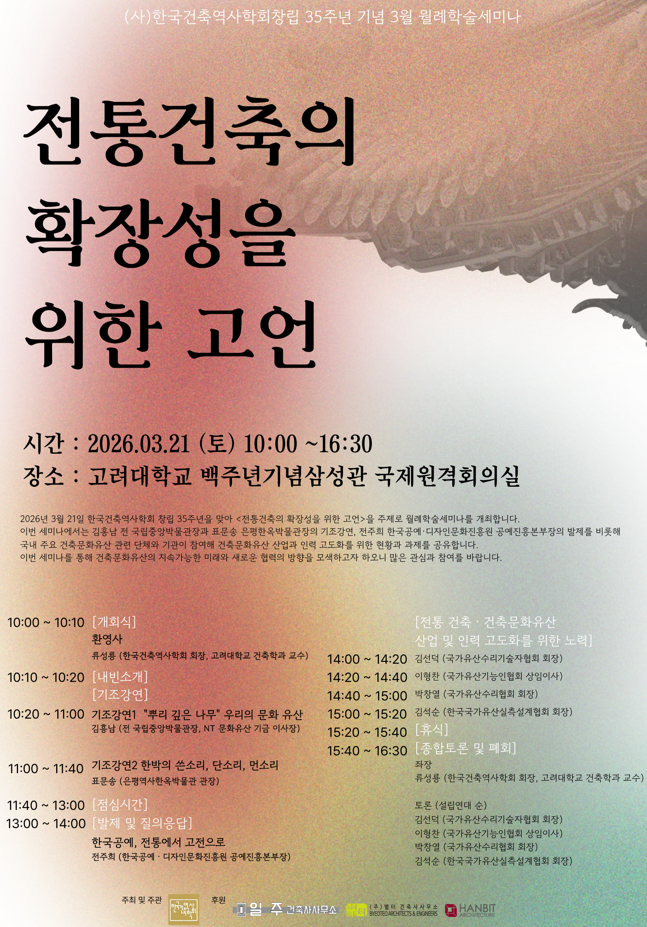 2026³â 3¿ù 21ÀÏ Çѱ¹°ÇÃ࿪»çÇÐȸ ⸳ 35ÁÖ³âÀ» ¸Â¾Æ <ÀüÅë°ÇÃàÀÇ È®À强À» À§ÇÑ °í¾ð>À» ÁÖÁ¦·Î ¿ù·ÊÇмú¼¼¹Ì³ª¸¦ °³ÃÖÇÕ´Ï´Ù.